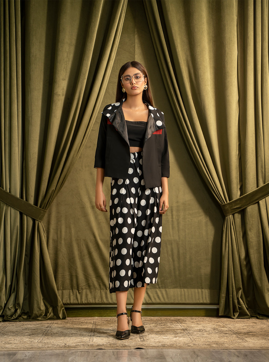 A modern twist on the classic co-ord set. The cropped polka-dot jacket pairs perfectly with a black bandeau and high-waisted trousers, mixing fun with sophistication. Ideal for evenings that need a bold yet timeless look.