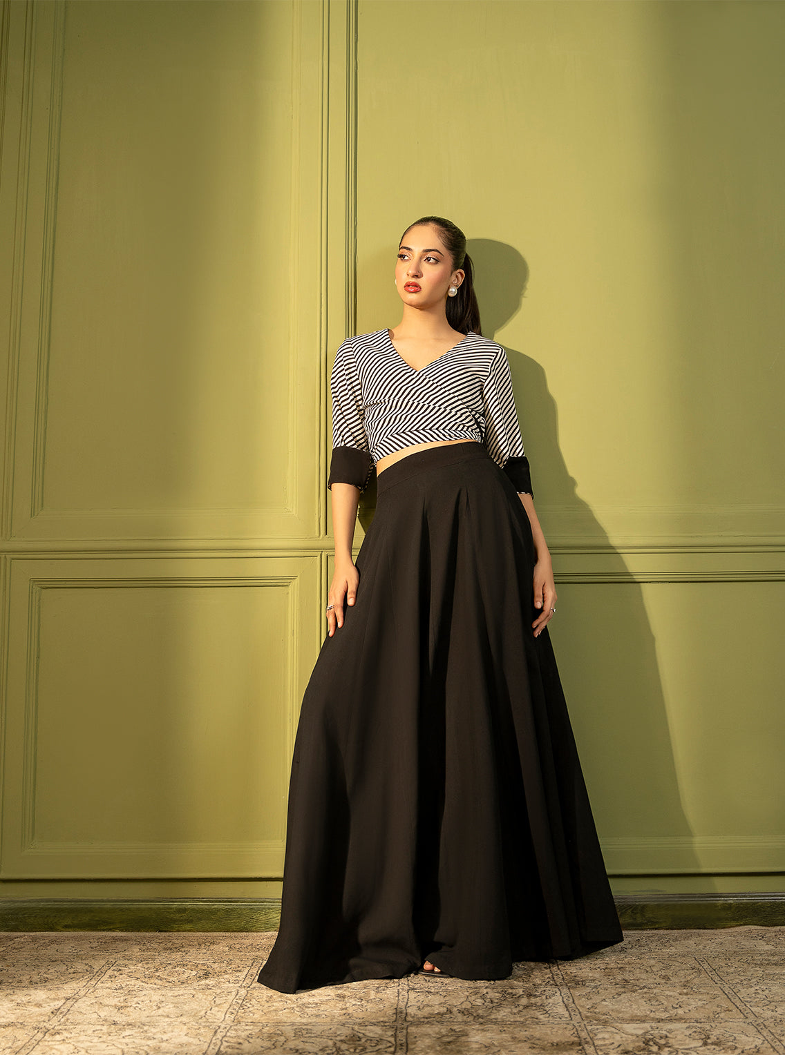 Classic meets contemporary in this striking black full-length skirt paired with a diagonally striped cropped blouse. The V-neckline and structured sleeves accentuate the silhouette, while the sweeping skirt brings elegance and power to eveningwear minimalism
